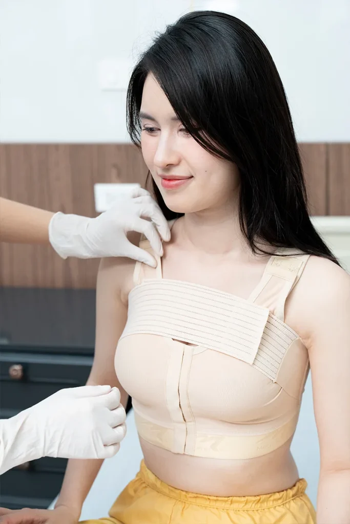 Sau mổ, Hằng được chăm sóc bởi đội ngũ điều dưỡng chuyên nghiệp: kiểm tra sinh hiệu, hướng dẫn mặc áo định hình, hướng dẫn tư thế ngủ, chăm sóc vết mổ và đặt lịch tái khám.